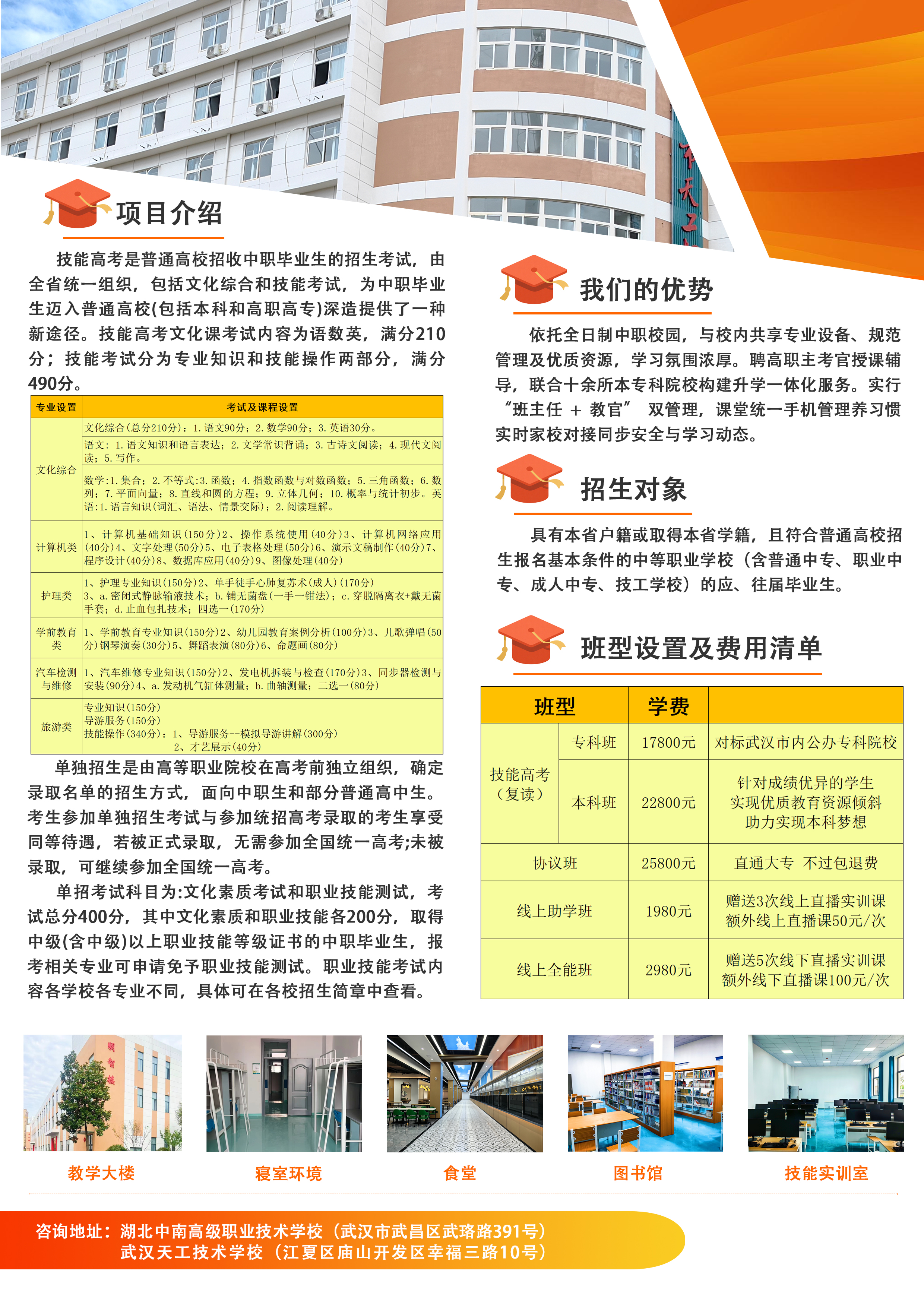 武汉职业技术大学是湖北省第一所公办职业本科学校,其前身是武汉职业技术学院,最早办学历史可以追溯到1973年。2025年2月,教育部批准以武汉职业技术学院为基础设立武汉职业技术大学。自创立以来,学校始终坚守“为党育人、为国育才”的崇高使命,全面落实立德树人根本任务,秉承“厚德、笃学、求实、拓新”的校训精神,不断创新办学体制机制、教育教学理念、人才培养模式,开创了区域化、国际化、现代化高职办学的成功范例,综合实力位居全国同类院校前列。学校现有光谷校区、光谷东校区、麻城校区等三个校区,校园占地面积2067亩,建筑面积61.32万平方米,固定资产总值16.58亿元,其中教科研设备总值3.71亿元。建有282个校内实践教学场所,与企业共建稳定的校外实习基地363个。馆藏图书总量为259.73万册,其中纸质图书155.84万册,数字资源共14种。学校设有光电与信息工程学院、智能制造学院、人工智能学院(信创产业学院)、建筑工程学院、商学院、智能商务学院、艺术设计学院、外语外贸学院、旅游与航空服务学院、时尚与传媒学院、生物工程学院、马克思主义学院、体育美育工作部共13个教学机构。学校坚持对接产业设置专业,锚定湖北“51020“先进制造业产业集群和五大现代服务业产业集群,持续调整专业布局。学校现有专科专业58个,2025年首批开设全日制本科专业6个,构建了多层次人才培养体系。